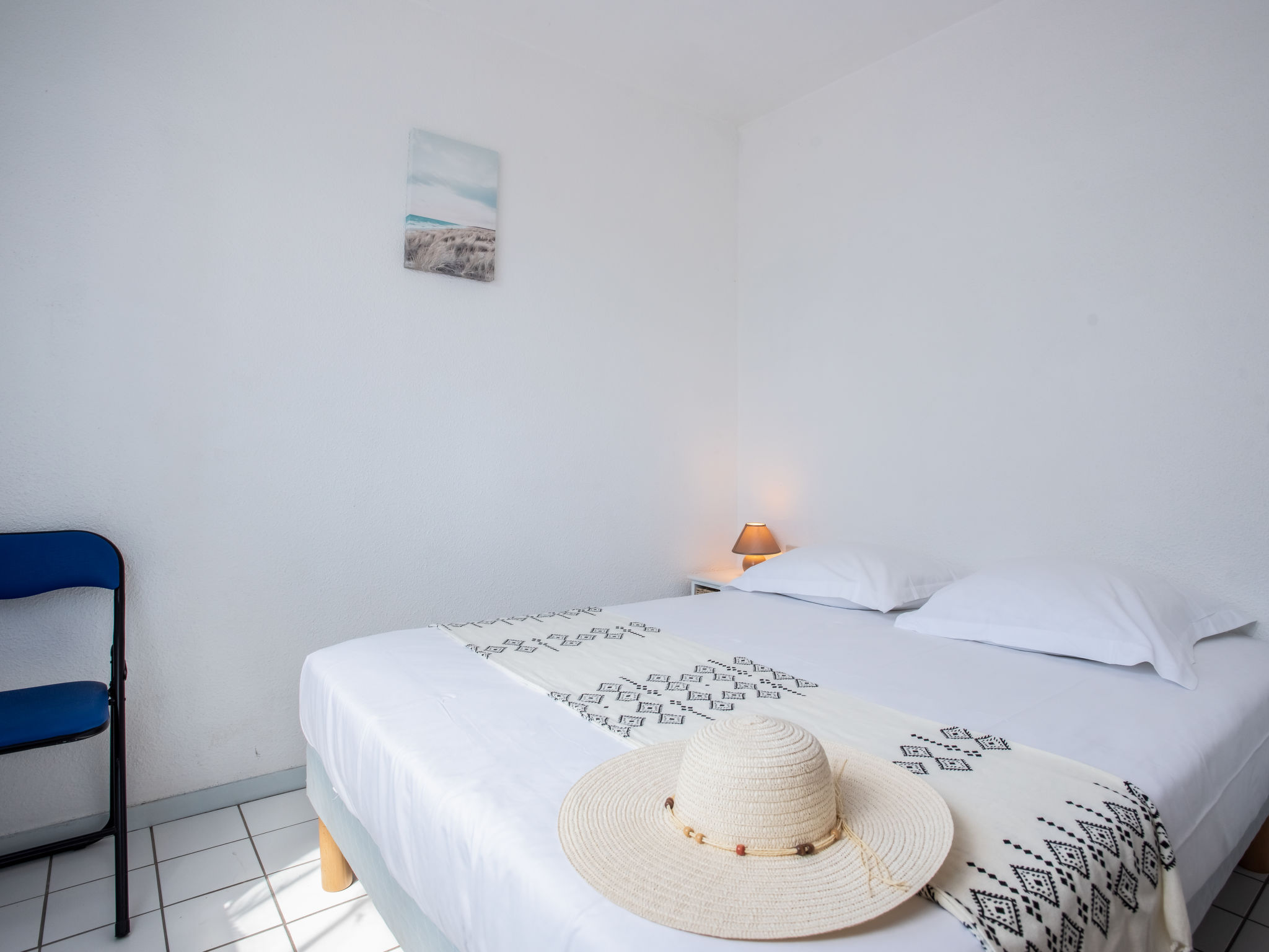 Appartement de 2 pièces 30 m2, au rez-de-chaussée, situation est. Séjour/salle à manger avec 1 divan-lit double (1 x 140 cm, longueur 190 cm), TV. Sortie sur la terrasse. 1 chambre avec 1 grand-lit (1 x 160 cm, longueur 200 cm). Coin cuisine (2 plaques de cuisson, four, lave-vaisselle, micro-ondes). Douche/WC. Chauffage électrique. Terrasse 10 m2, jardinet. Meubles de terrasse. Vue sur la mer. A disposition: lave-linge. Internet (Connexion WIFI, gratuit). Place de parking. Veuillez noter: TV seulement FR. Détecteur de fumée. 56234 000197 VY